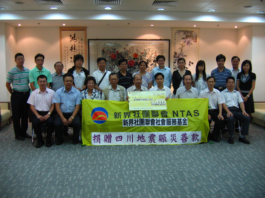 5.12地震災後三個月,由該會基金主席羅叔清、基金董事、地區委員會代表等一行人,到中聯辦新界工作部遞交善款支票,新界工作部副部長潘紹新代為接收,並將善款透過有關部門轉往災區支援重建工作。