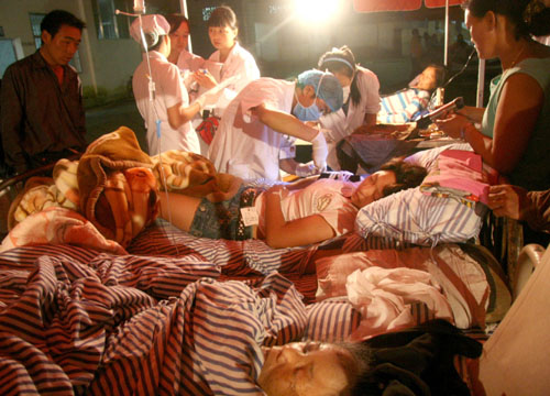 圖:8月22日凌晨,在盈江縣第一人民醫院空地臨時搭建的搶救中心,從縣域各地送來的地震傷員正在接受醫療救治 (新華社)