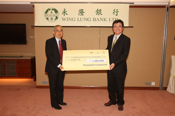 香港科技大學獲永隆銀行慈善基金捐贈一百萬港元,成立獎學金以嘉許成績優異的本科生。支票捐贈儀式於昨日舉行,由永隆銀行慈善基金主席伍步高(左)贈交支票予科大首席副校長錢大康。