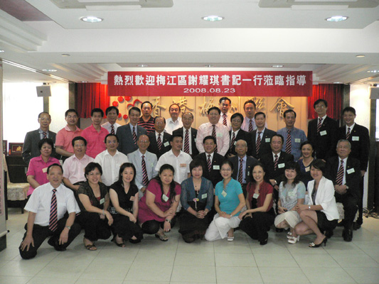 林光如致歡迎詞,熱烈歡迎謝耀琪書記、潘小韜區長一行蒞臨指導,何冬青、藍瑞明簡單介紹了梅州聯會的會務情況。謝耀琪說,今天我們來到梅州聯會,受到這麼高規格的接待,有如回到自己家一樣,他說,梅州聯會近年來在林光如會長及各位前輩領導下,為家鄉的各方面建設,特別在為家鄉培訓各級領導人才、資助貧困學生等方面作出了很大的貢獻,有目共睹,梅州聯會的名字日益深入家鄉人民心中,他說他們這次到訪梅州聯會,一是感謝梅州聯會各位鄉賢長期對梅江區的支持,二是今年9月中旬梅江區建區20周年,邀請梅州聯會組團回家鄉共同祝賀,林光如表示,一定會組團回去祝賀,最後互贈紀念品並一起照像留念。