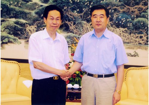 圖:廣東省委書記汪洋(右)和世界華僑華人社團聯合總會副會長胡國贊(左)親切握手