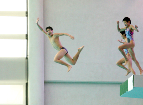 「嘩!點可以跳得咁高」,「真係一啲水花都無」!一浪又一浪的歡呼聲昨日震撼着荃灣城門谷游泳池,九名國家奧運金牌跳水健兒,以活潑而親切的姿態,表演高難度的跳水絕技,教全場近八百名觀眾如癡如醉。「跳水皇后」郭晶晶依然是焦點所在,火亮、王鑫和陳若琳自創的鬼馬跳水法,也逗得全場觀眾開懷大笑。歡眾都說,通宵排隊撲飛也是值得呢!