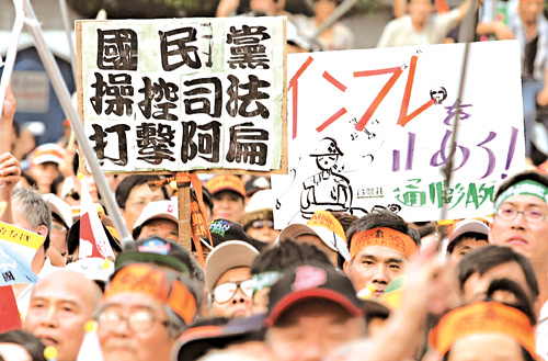 【本報訊】綜合台灣媒體及中通社三十日報道:馬英九上台後島內第一場大型抗議遊行活動,八月三十日下午登場,根據主辦單位台灣社以及民進黨的統計,約有六百輛遊車北上加入「百日怒吼、全民站出來」的遊行,估計有四萬人聚集在凱達格蘭大道上「嗆馬」。