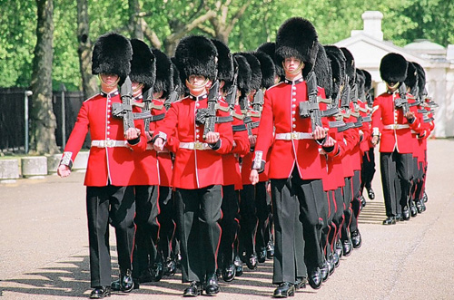 圖:守衛白金漢宮的御林軍頭戴的黑色熊皮高帽可能會消失(互聯網)