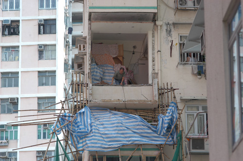 □有四十年歷史的觀塘小社區月華街,三十三座大廈當中約六百戶涉及僭建或非法改裝露台,對大廈結構安全造成嚴重隱憂。屋宇署去年先後發出清拆或還原令(回復原貌),當中月威大廈一戶業主前日聘請合資格的承辦商施工拆卸磚牆時,疑有人貪方便沒有即時移走泥頭,導致露台負荷過重倒塌,幸無釀成傷亡。\本報記者 俞凱穎 吳國洪