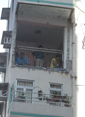 圖:塌露台單位裝上臨時圍欄(俞凱穎攝)