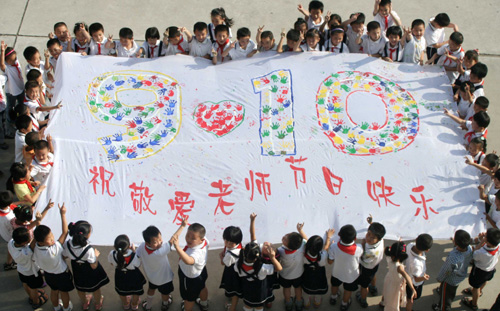 圖:安徽省含山縣環峰小學舉辦教師節慶祝活動,學生們將五彩小手印摁在布上,組成「9·10」圖案,將這幅集體創作的「手印作品」獻給老師,感謝師恩(新華社)