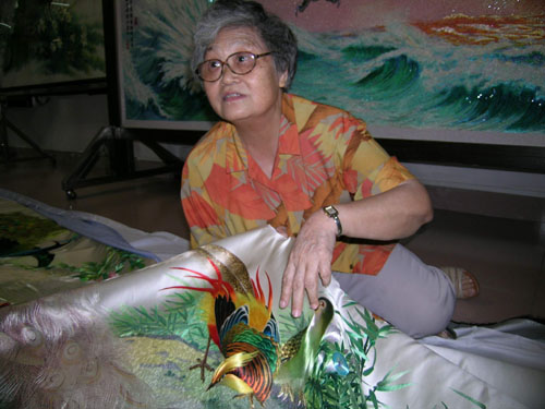圖:廣繡藝術大師陳少芳與其耗時十年完成的十三米多長的廣繡巨作(本報攝)