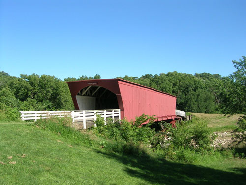 「你已經很近了,那橋離這裡只有兩英里地。」她告訴他,並主動給他帶路,後來請他到家裡吃晚飯,感到他「走了很長的路到她的廚房來,漫漫長路,何止以英里計!」在我的車上,里程表已經顯示兩千八百公里,離開州際公路也已有幾十里遠。車輪在粗糙的沙礫路面上軋過,留下一路細碎的呻吟聲和飛揚起的白塵。當玫瑰紅色、如一節火車車廂形狀的橋廊和白色的橋欄在路的盡頭出現時,才看到了兩輛車,三五個遊人。
