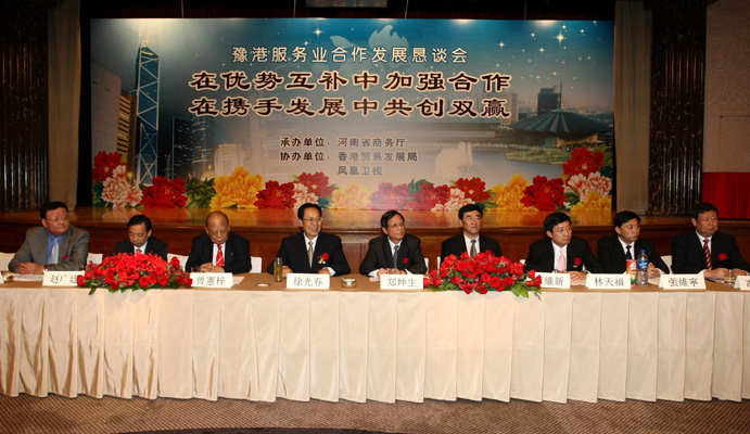 「豫港服務業合作發展懇談會」昨日在港舉行,逾百名香港工商界人士出席懇談會。會後即場簽訂的四項豫港合作發展協議項目,包括兩地服務貿易戰略合作框架及服務外包合作備忘錄。河南省省委書記徐光春表示,豫港在服務業八大領域可互補優勢,兩地合作發展前景廣闊。