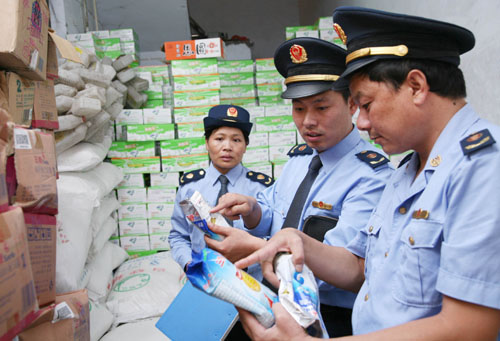 圖:工商局執法人員在寶豐三鹿乳品總經銷倉庫對問題奶粉登記封存(本報攝)
