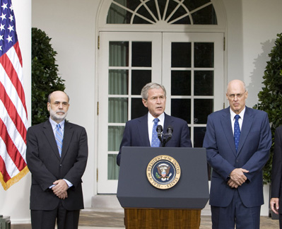 圖:布什(中)講述美國經濟情況。左為伯南克,右為保爾森(路透社)