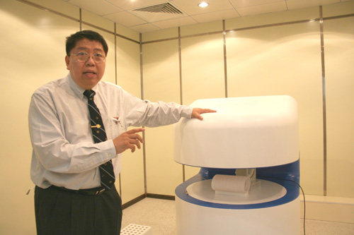 圖:美時醫療行政總裁馬啟元教授解釋,研發團隊透過創新的嘗試,把「高溫超導射頻線圈技術」與傳統的磁力共振技術結合