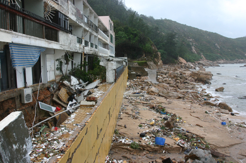 【本報訊】在八號風球下,長洲前晚出現小海嘯,海面颳起三層樓高的十米巨浪,襲擊東堤小築六幢三層高的村屋,其中三幢屋的露台崩塌,出現闊達十米巨坑,逾百名住客要黑夜緊急疏散,幸無人受傷。