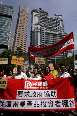 遊行人士昨早在中環遮打花園集合,然後遊行到政府總部,沿途高呼口號,要求政府協助他們追討應有權益,以及檢討現行機制,加強監察這類投資產品。他們皆是購買了雷曼迷你債券和相關投資產品的投資者。