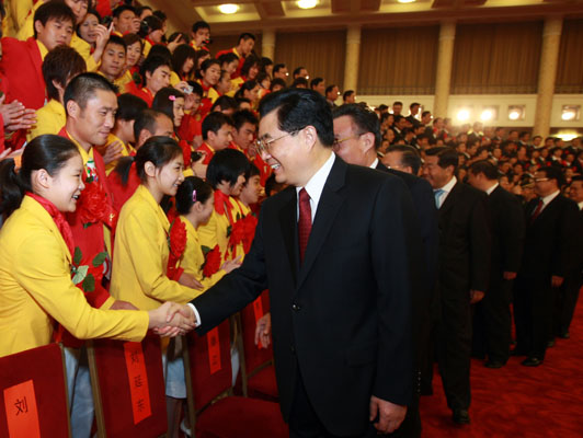 胡錦濤強調,要認真總結和發揚北京奧運會、殘奧會精神,進一步推動中國由體育大國向體育強國邁進。