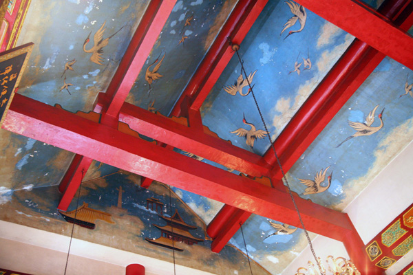 抬頭望向金字頂的天花板,除去橫樑,可見一片「藍天白雲」,四周有眾多「白鶴」飛翔。鶴在道教中代表仙人的坐騎,在民間代表長壽。再望左右兩邊山牆的頂部,則見雲海間有殿宇、南天門和華表。這些寓意深長的圖象旨在告訴善信,大殿是神仙境地,他們已由俗界進入了仙界範圍。