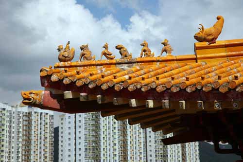 香港許多中式的宗教建築,在飛簷翹角上排列了一些琉璃瓦走獸,但由於高高在上,下面的人很難看得清楚。而在粉嶺的蓬瀛仙館,只要登上元辰殿,就可近觀正殿兜率宮屋脊上的瑞獸了。