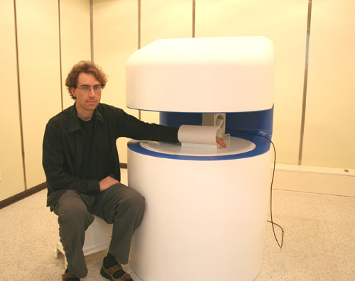 圖:應科院的研發總監Corbett Ray Rowell於實驗室示範最新研發的磁力共振儀,其具備成本低、質素高、體積小的特色。研究的創新嘗試是把「高溫超導射頻線圈技術」與傳統的磁力共振技術結合