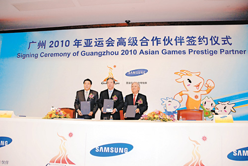 廣州亞組委與三星中國日前聯合簽署協議宣布三星正式成為廣州2010年亞運會高級合作夥伴。亞奧理事會副主席于再清,廣州亞組委常務副秘書長、廣州市副市長許瑞生以及大中華區三星集團總裁朴根熙共同簽署了合作協議。