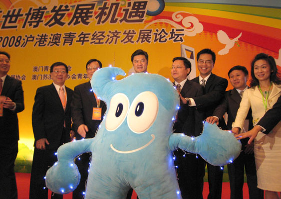 圖:滬港澳三地青年代表與上海世博會吉祥物「海寶」牽手,啟動論壇(中新社)