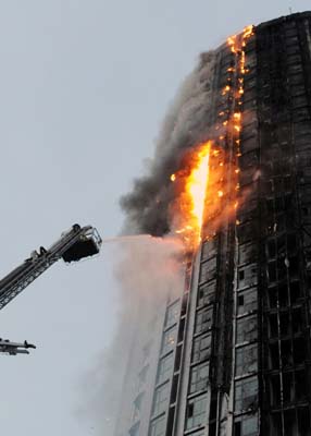 9日下午4時許,黑龍江省哈爾濱市道里區經緯街附近的經緯360大廈(雙子座,一至四層連體)發生大火,現場火勢很大,濃煙滾滾。據悉,這座大廈是新建的公寓樓,該樓外部工程已完工,內部正在裝修。着火時,樓內基本上都是施工人員,人數不詳。現場不時有高空墮物,有人在四樓平台上等待援救,還聽到爆破的聲音,據知有焦急的群眾想衝入火場,但卻被警察制止。圖為消防員駕起雲梯救火。(新華社)