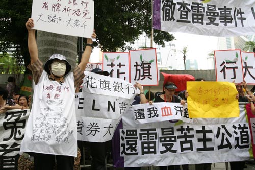 圖:新屆立會的首項議員動議與雷曼事件有關,並將由林健鋒提出。上圖為雷曼苦主前日在立法會門外示威(資料圖片)