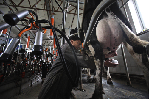 圖:一名奶牛養殖戶正在為奶牛擠奶