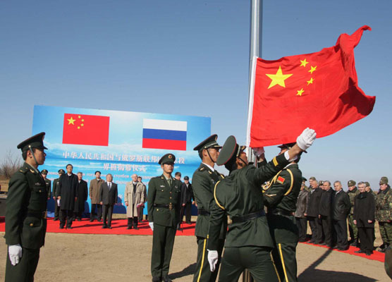 圖:中俄界樁揭幕儀式上,升起中華人民共和國國旗(新華社)