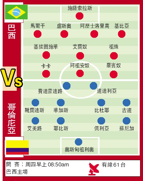 客軍哥倫比亞上輪分組賽主場○比一不敵榜首的巴拉圭,分組賽連續輸第三場,三戰合共淨吞六隻光蛋。不過,哥倫比亞近兩次對戰巴西都能夠力保不失,連續兩仗守和○比○,但球隊近況認真差,今次作客巴西相信亦難逃一敗。