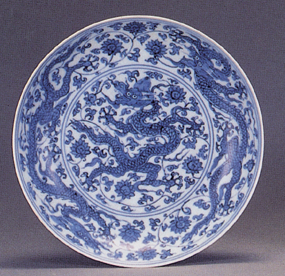 例如附圖穿花游龍紋青花直口瓷盤,就是正德年間製(雙圈款)。正德初期仍沿用成化及弘治青花的「平等青」料,故色調淡雅,配合薄胎白釉,甚有水準。