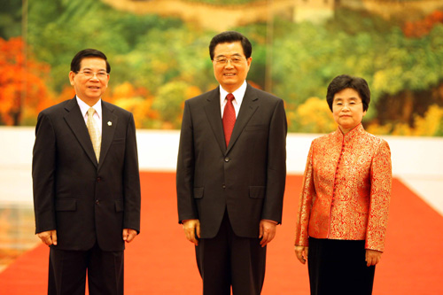 圖:中國國家主席胡錦濤和夫人劉永清歡迎越南國家主席阮明哲出席北京奧運會