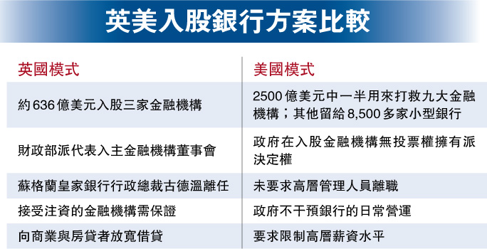 不同的是,布什9月29日的七千億美元救市方案遭眾議否決,結果引起全球股市大瀉。而白高敦的救市方案在英國下議院即時得到各在野政黨表態支持。結果,兩次政府撥款公布之後金融時報指數均見短暫回升。