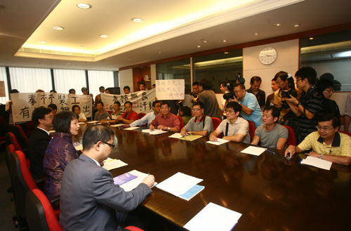 圖:工人在工聯會人員陪同下到勞工處開會,希望處方能釐清他們與泰林的僱傭關係(蔡文豪攝)