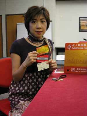 圖:梁靜雯介紹「鐵路合併一周年」紀念車票套裝 (本報攝)