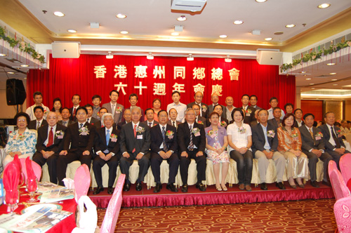 香港惠州同鄉總會日前在油麻地聯邦皇宮酒樓舉行六十周年會慶聯歡晚會,應邀出席慶典的主禮嘉賓包括中聯辦九龍工作部副部長余汝文、中聯辦協調部處長楊錦玲、香港旭日集團董事長楊釗、立法會議員李慧琼、油尖旺區議會主席鍾港武、香港崇正總會常務理事長劉南琴、廣東省政協委員、沙田區議會議員、惠州同鄉總會名譽法律顧問簡松年等。