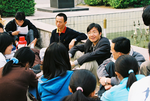 圖:2003年非典時期,中國政法大學諸多教職員工堅守工作崗位。程春明教授(藍圈者)與著名法學家龍衛球教授與學生們在中國政法大學校園裡座談。