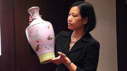 圖:曾志芬表示,清乾隆御製「粉紅地粉彩軋道蝴蝶瓶」是孤品(本報攝)