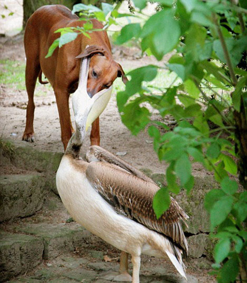 據德國北萊茵—威斯特準倫州城鎮赫斯特爾某異域禽鳥養殖場的三十八歲主人亞當憶述:「我當時在場內的戶外廚房,為鳥兒們準備食物。這時,我察覺到(一歲塘鵝)彼得里就在我身邊,正在找小吃填肚子。我決定拿預先準備好的雪藏雞餵牠。這時(雌性羅德西亞背脊犬)卡蒂吉納走過來要爭奪:牠在凌空咬住那隻雪藏雞,『嗖』一聲吞下彼得里的晚餐!」