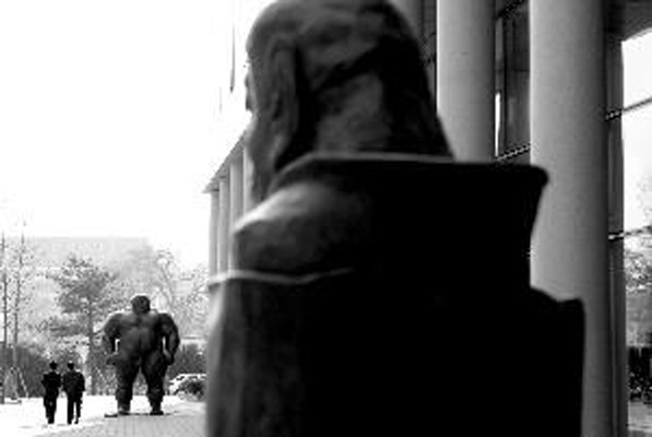 近日,北京大學光華管理學院新樓門前立起的兩尊雕塑引發了爭議:一尊逾三米高、露生殖器的壯漢雕塑與張嘴露齒的老子雕像相對而立。兩雕塑分別命名為「蒙古漢──站」和「剛柔之道─老子像」。