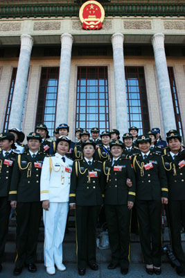 圖:三十一日,中國婦女第十次全國代表大會閉幕。這是閉幕式前,部分女軍人代表在人民大會堂前合影 (新華社)