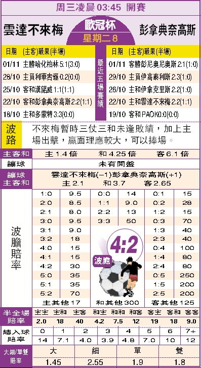 星期二(8)雲達不來梅Vs彭拿典奈高斯往績及各項賠率