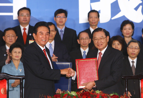 圖:海協會長陳雲林(左)與海基會董事長江丙坤四日就海運直航等簽署協議後交換協議文本(新華社)