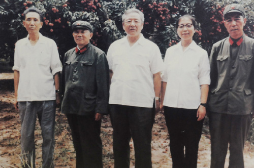 圖:1980年習仲勳(左三)到深圳視察時,與深圳第一任市委書記張勳莆(左)等合影,左四為習仲勳夫人齊心。