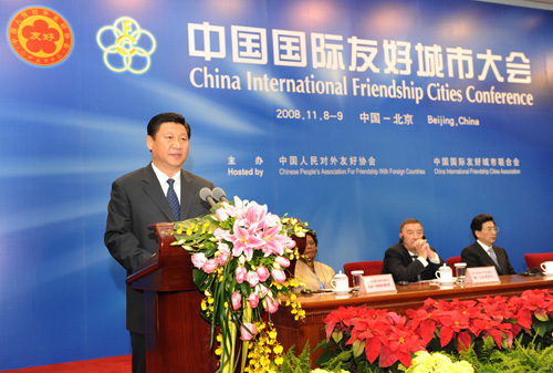 習近平代表中國政府向大會的召開表示祝賀。他說,今年是中國開創國際友好城市活動三十五周年。一九七三年,中國天津與日本神戶締結了第一對中外友好城市關係,開闢了中國地方政府對外交流合作的重要渠道。改革開放以來,中國的國際友好城市活動步入全面快速發展階段。目前,中國已與一百二十個國家建立了一四九七對友好城市關係。國際友好城市活動已成為中國同有關國家雙邊關係的重要組成部分,促進了中國同各國的交流合作,增進了中國人民同各國人民的相互了解和友誼。