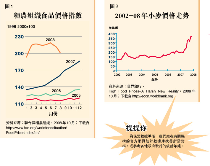 我們可從不同的途徑搜集得到相關資料,如公共圖書館或互聯網,其中在以下兩個網站,便載有近年糧食價格的變動情況,以及有關全球糧食危機的分析文章。
