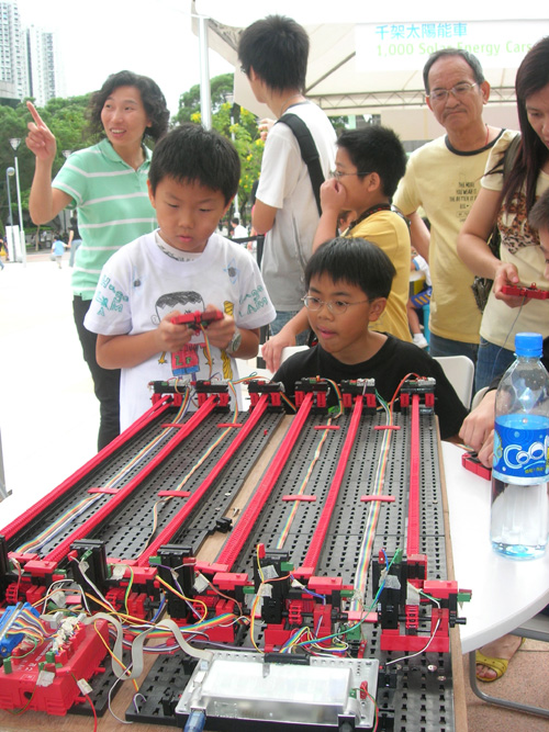這一天,在天水圍公園和銀座廣場,入場的大朋友小朋友都可以在「工程積木」工作坊裡,用塑膠模造成的微型工業零部件,動手製作自動門、乾手機、交通燈等模型,為生活中的機械產品注入新智能,帶出技術改良新角度。
