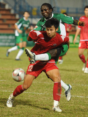 圖:愉園前鋒高梵(後)欲起左腳叩關,遭謝菲聯球員馮卓毅阻擋(本報攝)