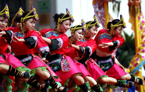 浙江省「千鎮萬村種文化」活動15日在杭州舉行。來自浙江各地的24個文藝節目和近500名農民演員以各種形式展示「田野的風采」。圖為麗水市雲和縣霧溪畬族姑娘在表演舞蹈《山哈布呢崽》。(新華社)