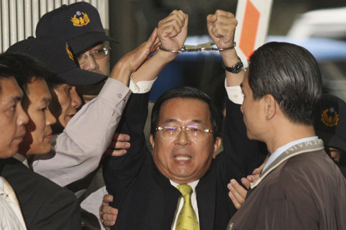 圖:陳水扁11日遭特偵組傳訊,其後被戴上手銬移送台北地方法院,成為台灣史上第一個被收押的卸任「總統」